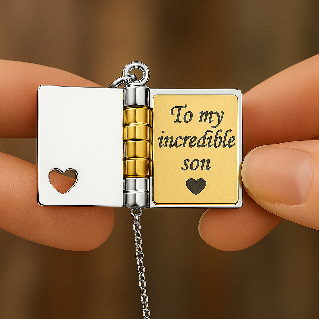 The My Champion Necklace opens just like a book, revealing a heartfelt message he'll carry close to his heart.