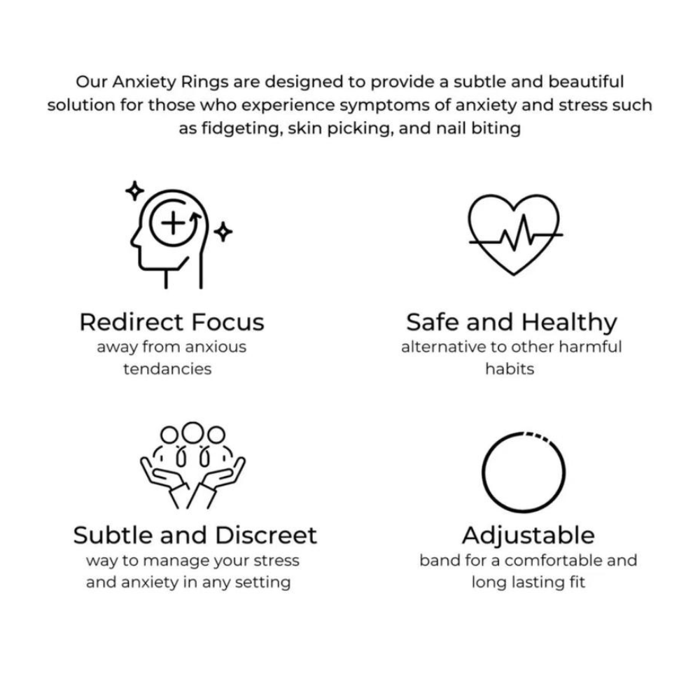 The spinning band helps release nervous energy and brings instant calm, making it the perfect everyday fidget ring for anxious hands.